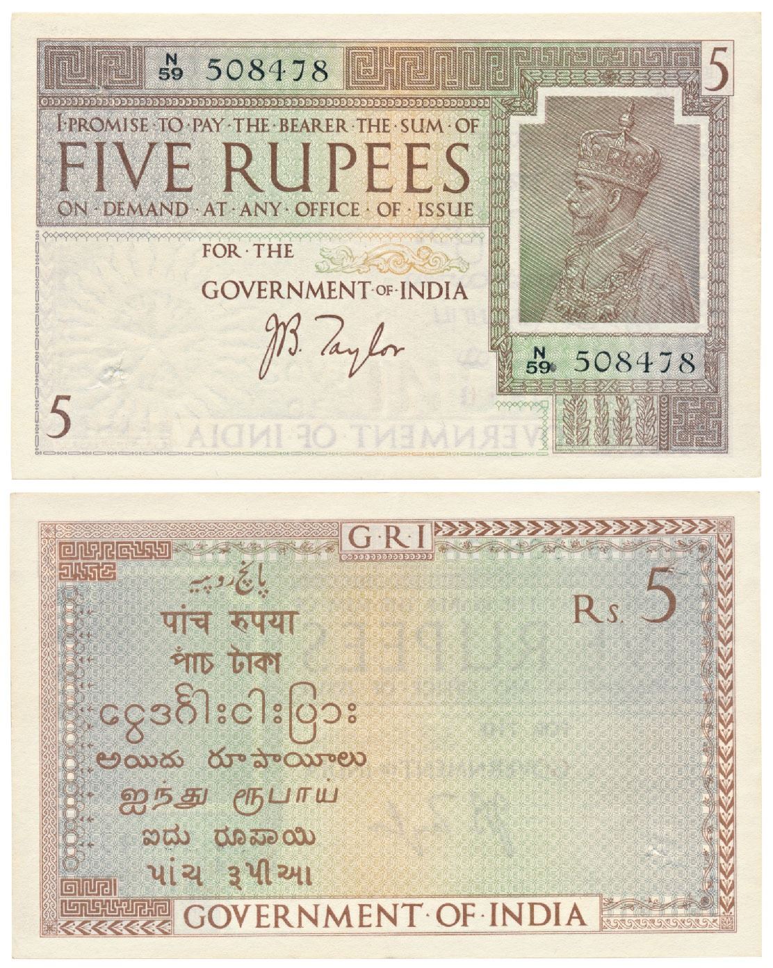 George V, Rupees 5, 1st issue, 1925, signed J. B. Taylor, (J&R 3.4.2). Crisp, Uncirculated, Very Rare in such a high grade.
