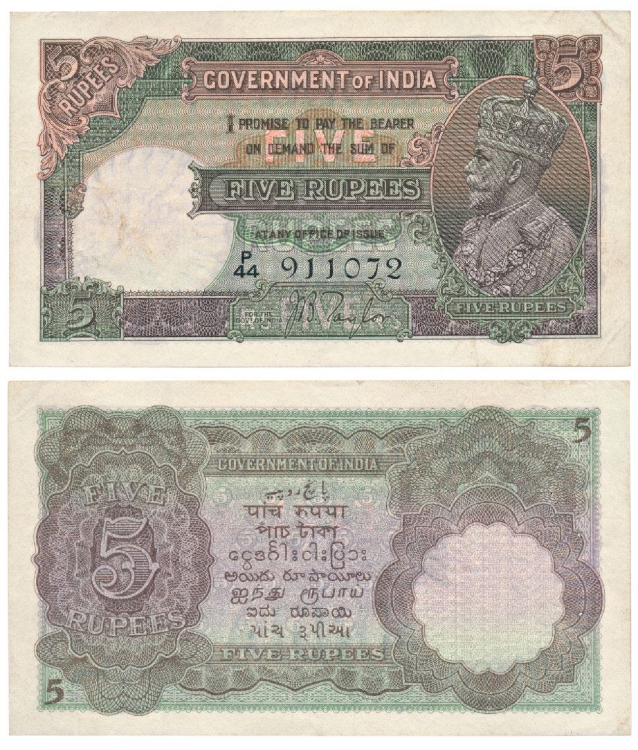 George V, Rupees 5, 2nd issue, 1933, signed J. B. Taylor, thin paper variety, (J&R 3.5.1A). No folds but slight staining in the watermark area and top right corner, About Extremely Fine, Scarce.