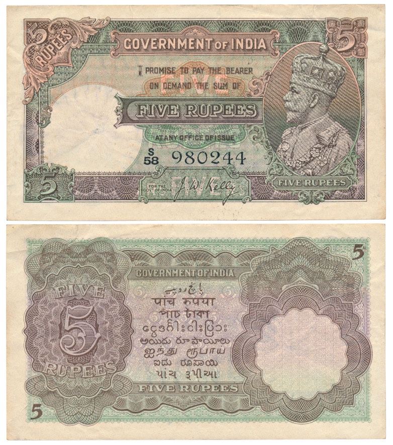 George V, Rupees 5, 2nd issue, 1934, signed J. W. Kelly (J&R 3.5.2). Extremely Fine, Scarce.