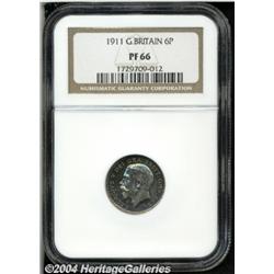 <B>George V Silver 1911 Proof Set, </B></I>eight coins, all certified by NGC: Sixpence, Shilling, Florin and Halfcrown, all Proof 66 and beautifully toned, plus the Maundy Set, 1 Pence Proof 64, 2 Pence Proof 65, 3 Pence Proof 64 and 4 Pence Proof 67. A choice certified set and very attractive. 8 coins <BR><BR><B>Important notice:</B> Heritage usually auctions material at the rate of 200-250 lots per hour. On some occasions eBay Live bid software or the Internet may not be able to keep up with the pace of the auction. We recommend placing a realistic absentee bid now as insurance to avoid disappointment. Occasionally the auctioneer may eliminate or reject an eBay Live bid, and the auctioneer may also reopen a lot after the close of the eBay live bidding (usually because we missed an audience bid), and may reject your bid even if it shows you as the winning bidder. By bidding via eBay Live, you agree that Heritage may award the lot to another bidder at its sole discretion under the circumstances described above or any other reasonable circumstances. Since eBay bids are not shown to us until we open the lot on the floor, we treat those bids just like floor bids. In most cases the floor responds before the eBay bid is presented to us, due to Internet lag time, so for consistency we have made it a policy that floor bids are always considered first over tie eBay live bids. Also please note that all Heritage lots purchased through eBay Live carry a 20% Buyer's Premium. Please make sure you read the Terms and Conditions before you bid.