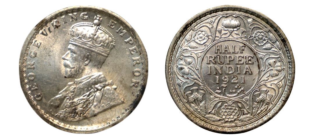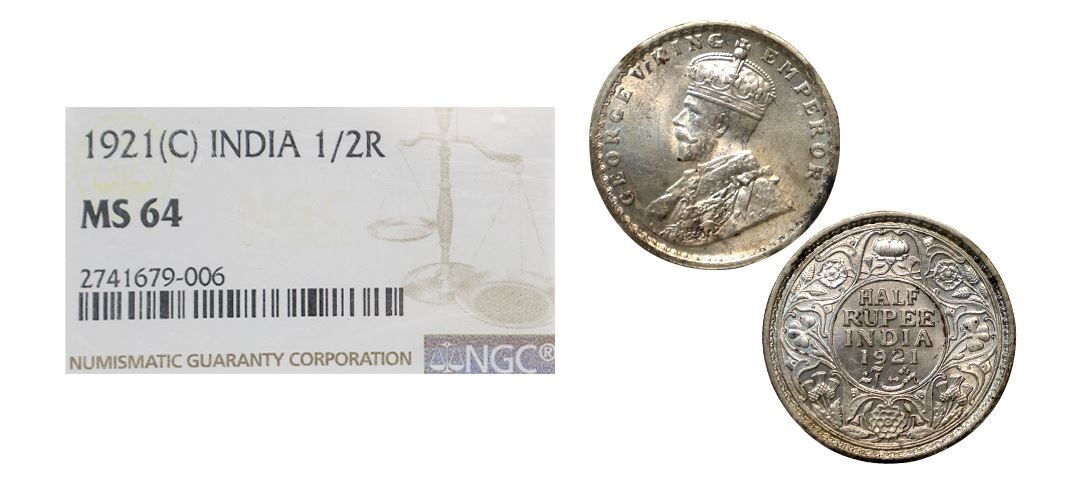 George V, Silver ½ Rupee, 1921, Calcutta Mint, (Prid 324). Graded by NGC MS64.