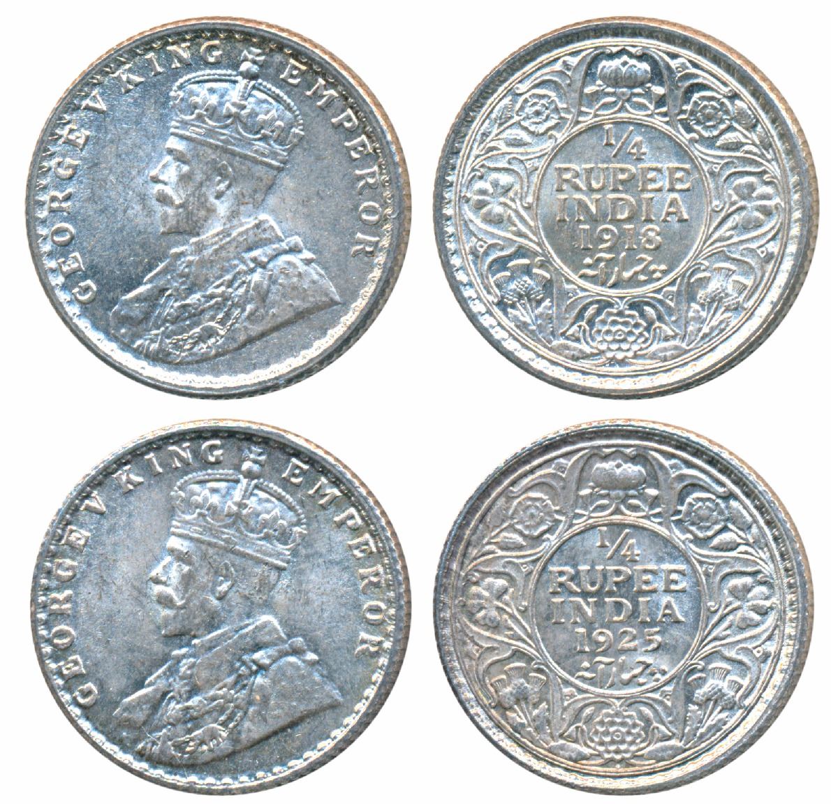 George V, Silver ¼ Rupee (2), 1918, Calcutta Mint; 1925, Bombay Mint (Prid 447 & 458). Uncirculated. (2)