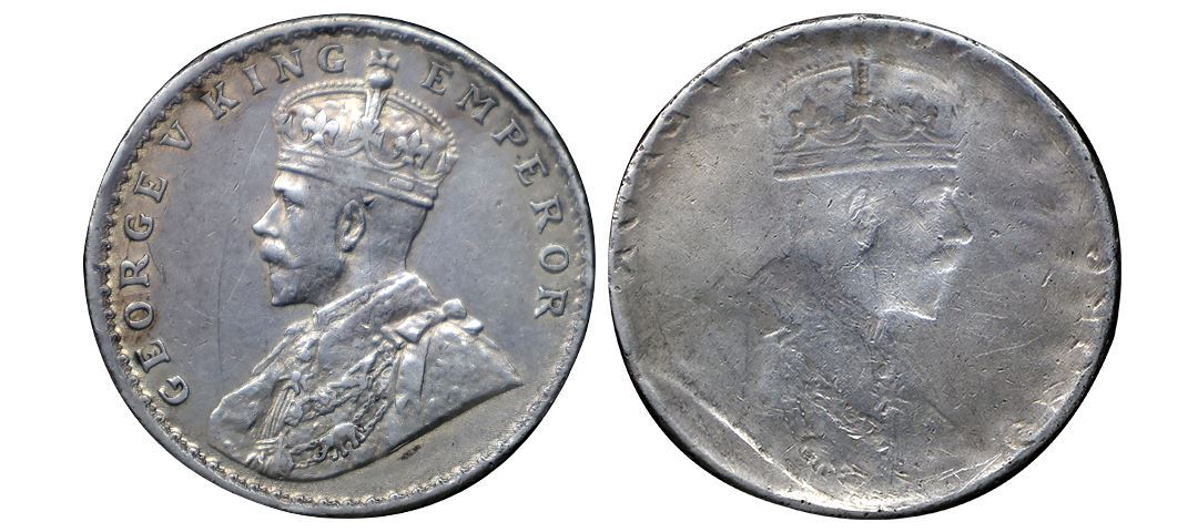 George V, Silver Rupee, Deep Brockage Error, Error: clear obverse lakhi brockage with full impressio