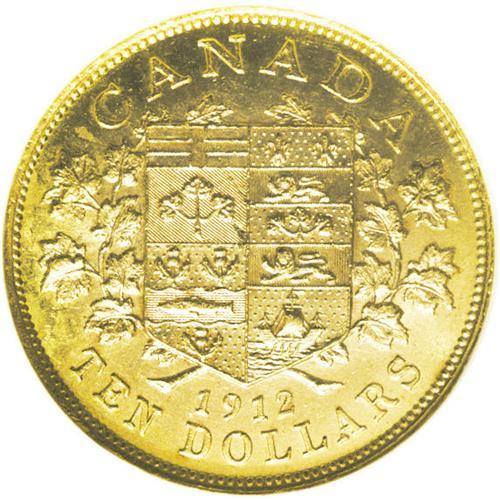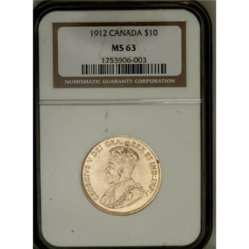 <B>George V gold 10 Dollars 1912, </B></I>KM27, MS63 NGC, fully lustrous with just the expected contact marks on the obverse. A very solid example of this elusive grade.