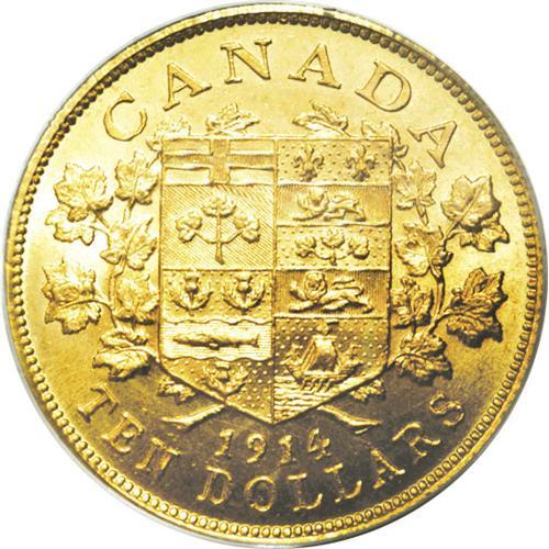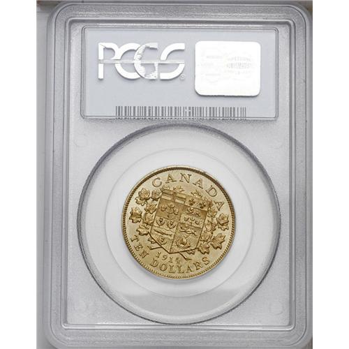 <B>George V gold 10 Dollars 1914, </B></I>KM27, MS64 PCGS, a superb coin with lightly toned, original surfaces and only a scattering of minute contact marks in the obverse fields. Extremely rare grade for this date, only six have been graded MS64 by PCGS, and none higher.<BR><I>From the Dominion Collection.</B></I>