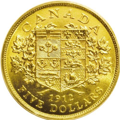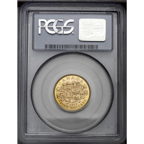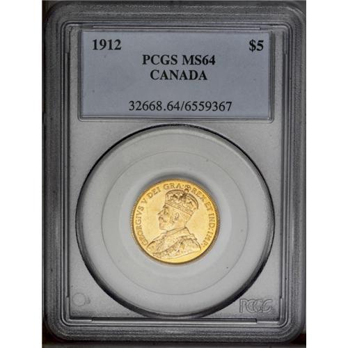 <B>George V gold 5 Dollars 1912, </B></I>KM26, MS64 PCGS, an appealing original coin with light orange patina.<BR><I>From the Dominion Collection.</B></I>