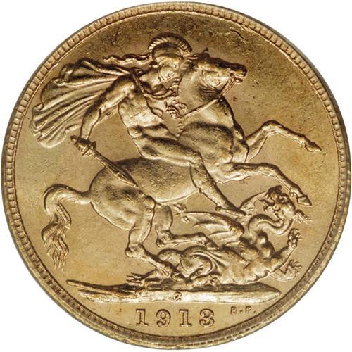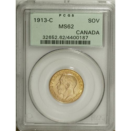 <B>George V gold Sovereign 1913C, </B></I>KM20, MS62 PCGS, boldly struck with appealing old-time toning. A very nice example of this rare date.<BR><BR><b>Shipping:</b> Coin/Currency (<a target="_blank" href="http://www.heritageauctions.com/common/shipping.php">view shipping information</a>)