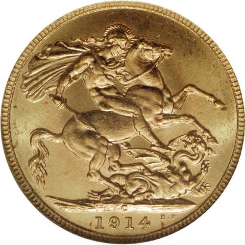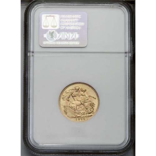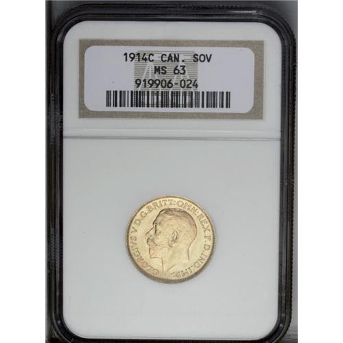 <B>George V gold Sovereign 1914C, </B></I>KM20, MS63 NGC, choice and lustrous, a premium coin for this designation. Scarce date.<BR><BR><b>Shipping:</b> Coin/Currency (<a target="_blank" href="http://www.heritageauctions.com/common/shipping.php">view shipping information</a>)