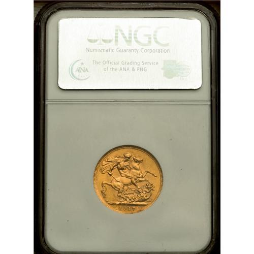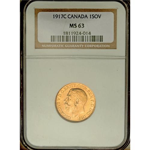 <B>George V gold Sovereign 1917C, </B></I>KM20, MS63 NGC.<BR><BR><b>Shipping:</b> Coin/Currency (<a target="_blank" href="http://www.heritageauctions.com/common/shipping.php">view shipping information</a>)