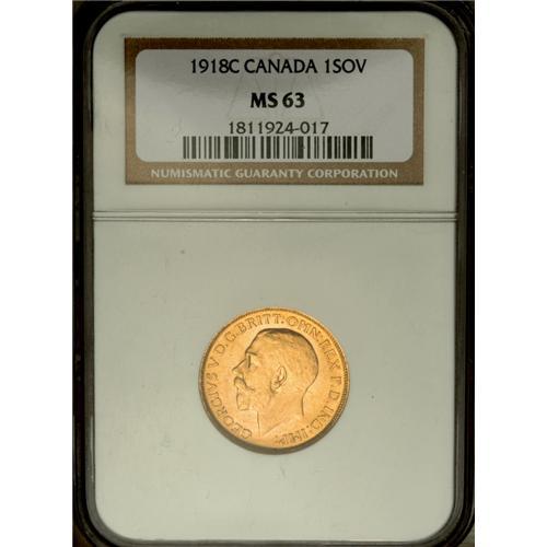 George V gold Sovereign 1918C, KM20, MS63 NGC, scarce i