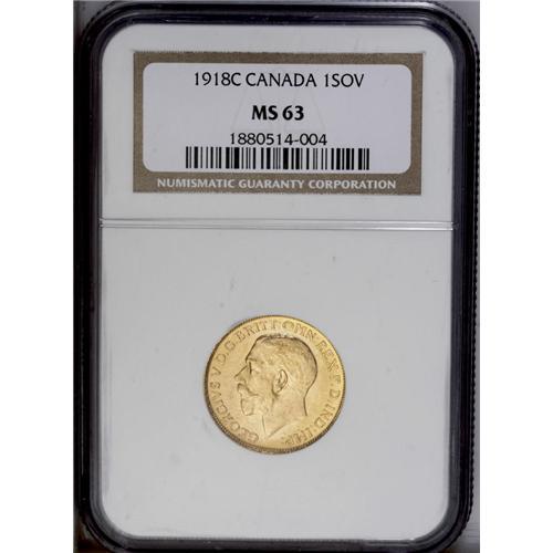 George V gold Sovereign 1918C, KM20, MS63 NGC.