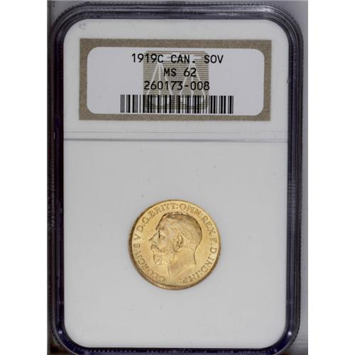 <B>George V gold Sovereign 1919C,</B></I> KM20, MS62 NGC. Lightly abraded with full luster.