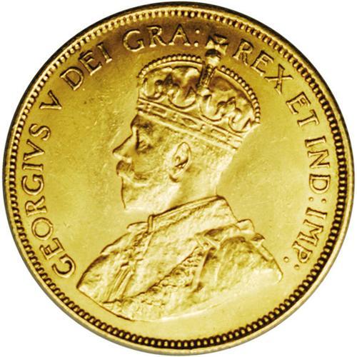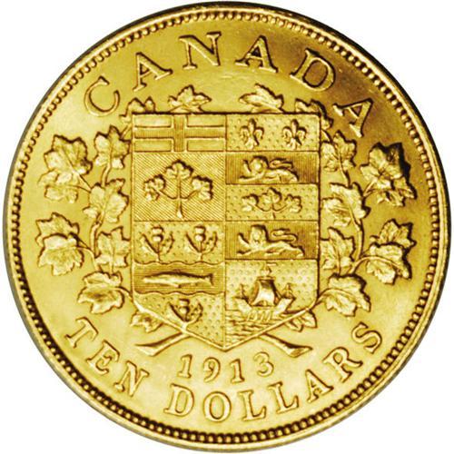 <B>George V gold Ten Dollars 1913, </B></I>KM27, UNC with unusually blemish-free surfaces, but with light hairlines in the obverse fields and the reverse has been cleaned, dulling the luster.