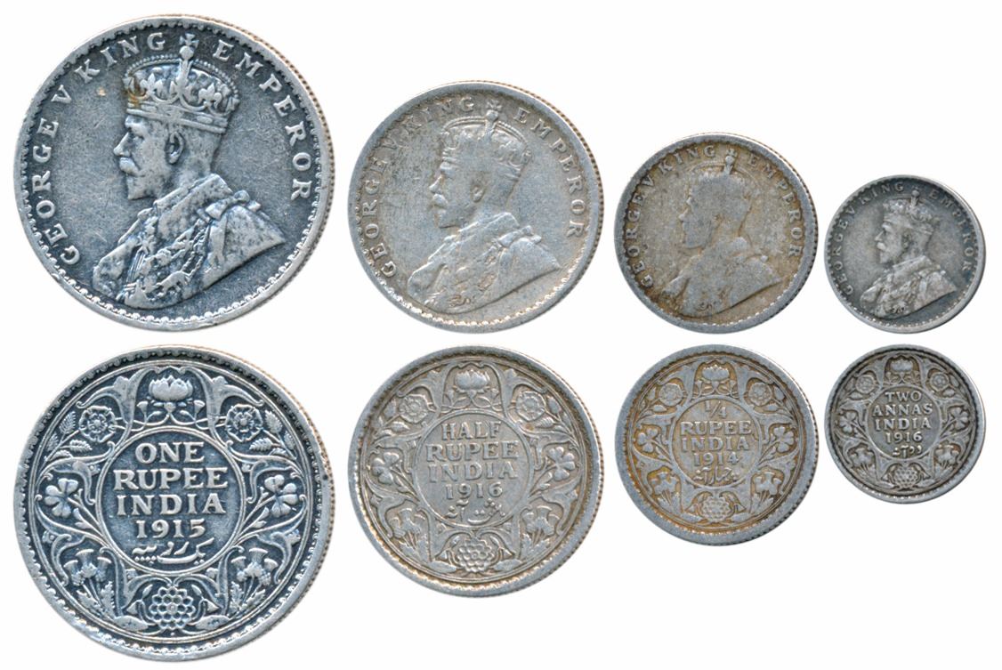 George V, set of 4, Silver Rupee, ½, ¼ and 2 Annas, 1915, 1916, 1914 and 1916. Very Fine. (4)