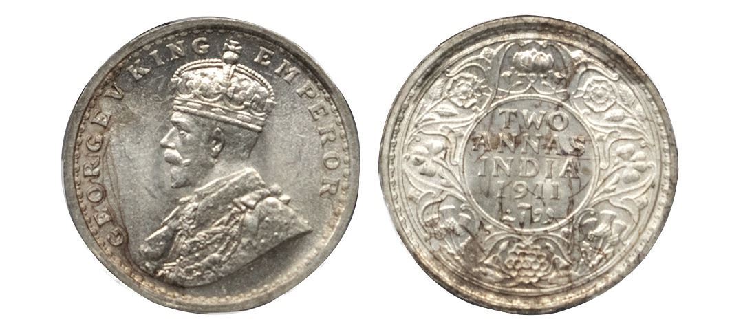 George V, silver 2 annas, 1911, Calcutta mint, no dot, pig type, PR 564; GK 1107. NGC graded MS64,