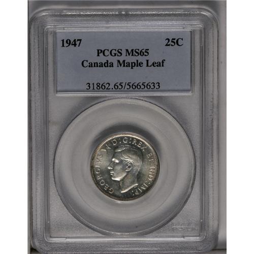<B>George VI 25 Cents 1947 Maple Leaf,</B></I> KM35, MS65 PCGS. Fully brilliant with pale golden toning and a superb strike.<BR><I>From the Dominion Collection.</B></I>