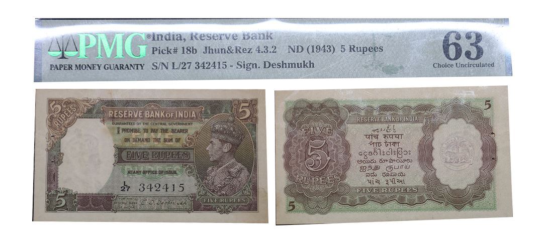 George VI, 5 rupees, 1st issue, ND (1944), signed by C.D. Deshmukh, serial no.: L27 342415, J&R 4.3.2. Staple holes at issue, PMG graded 63 Choice Uncirculated, Minor Rust, Rare.
