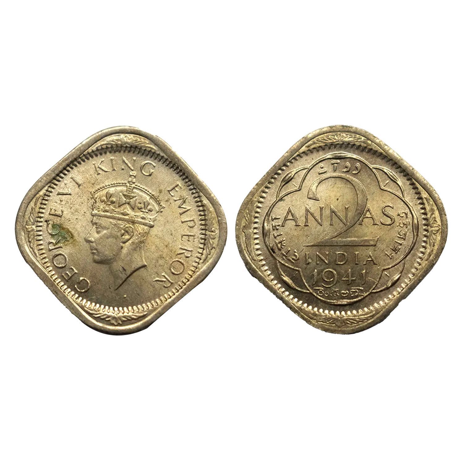 George VI, Copper-Nickel, 2 Annas, 1941, Calcutta Mint, No dots by year, Head Type II. obv. Desing type I .