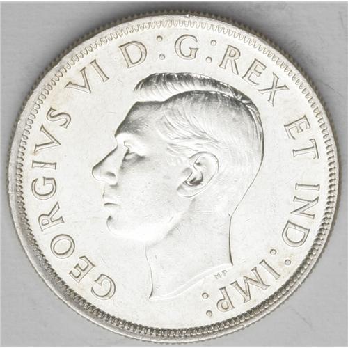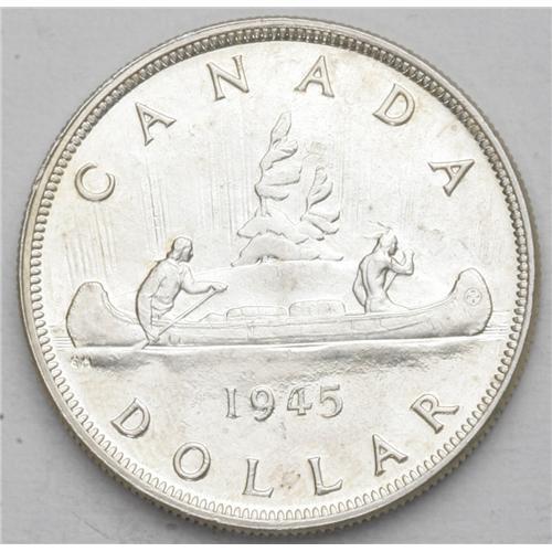 <B>George VI Dollar 1945,</B></I> KM37, a typical AU with a touch of frosting on the Kings head and contact marks in the fields.