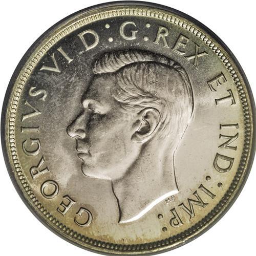<B>George VI Dollar 1947 Blunt 7, </B></I>Ex: Belzberg Collection, KM37, MS65 PCGS, a most appealing coin with frosty luster and just a hint of light champagne patina. Very rare grade - only six have been certified MS65 by PCGS, and none finer.<BR><I>From the Wellington Collection..</B></I>