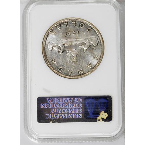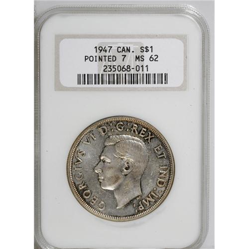 <B>George VI Dollar 1947 Pointed 7, 4X HP, </B></I>KM37, MS62 NGC, attractive golden patina in the legends. The variety information is not recorded on the holder.