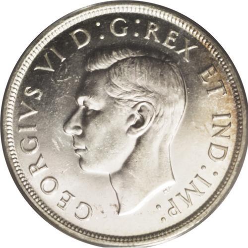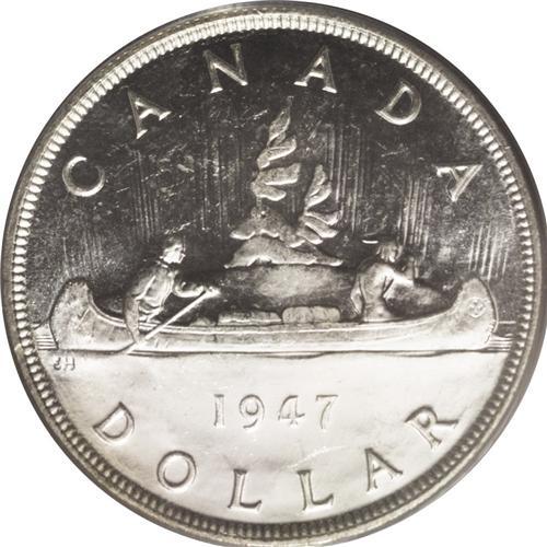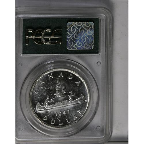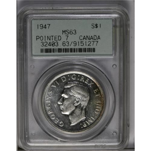 <B>George VI Dollar 1947 Pointed 7, </B></I>KM37, MS63 PCGS, full mint brilliance with some light champagne toning in the obverse legends. Very scarce grade for this date and variety.<BR><I>From the Dominion Collection.</B></I>