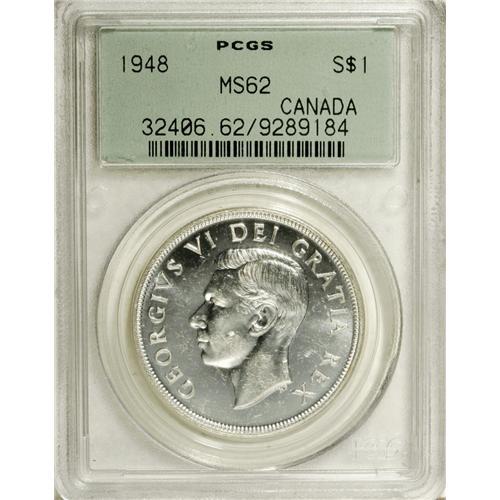 <B>George VI Dollar 1948, </B></I>KM46, MS62 PCGS, a fully lustrous and attractive example of this key date.<BR><BR><b>Shipping:</b> Coin/Currency (<a target="_blank" href="http://www.heritageauctions.com/common/shipping.php">view shipping information</a>)