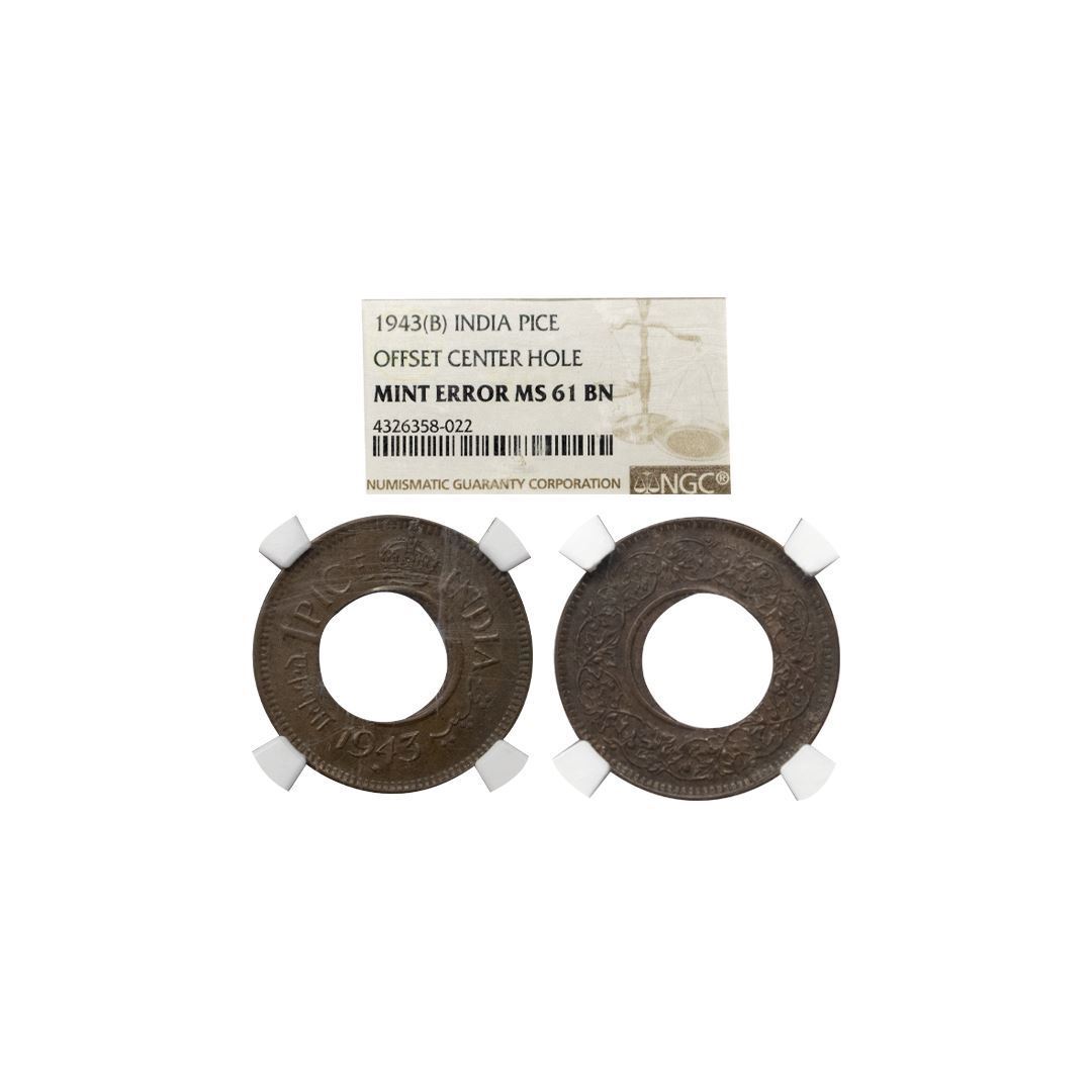 George VI, Hole Shifting Error, Copper 1 Pice, 1943 Bombay Mint, graded as Mint Error MS61 BN by NGC, rare