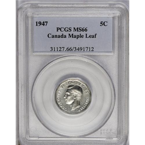<B>George VI 5 Cents 1947 Maple Leaf,</B></I> KM39a, MS66 PCGS. Superbly struck for the issue with bright luster and near-flawless surfaces. Only two pieces have been certified finer by PCGS.<BR><I>From the Dominion Collection.</B></I>