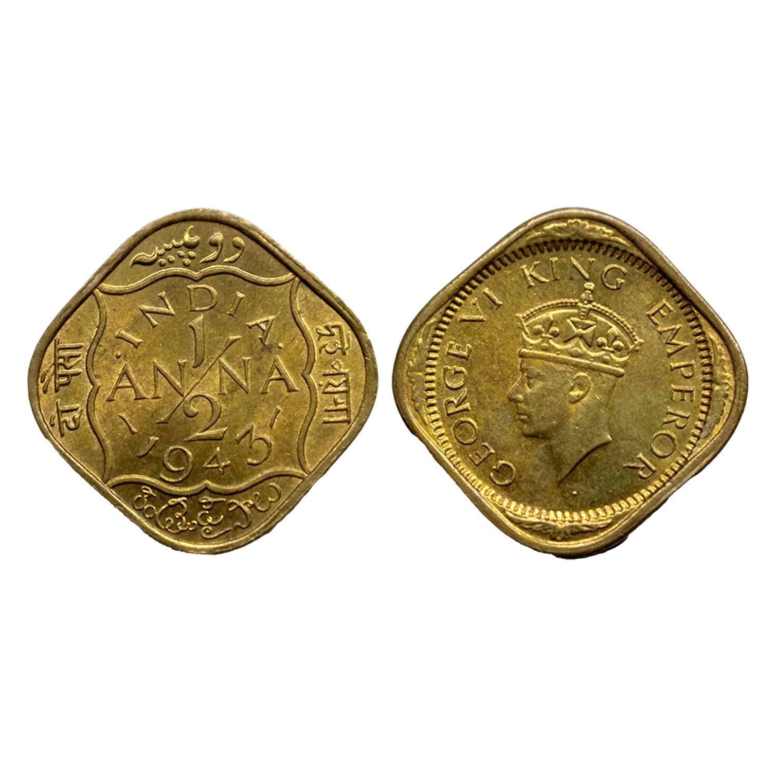 George VI, Nickel-Brass, 1/2 Anna, 1943, Calcutta Mint, Dots by India, Dashes by year, F. Prid 984.