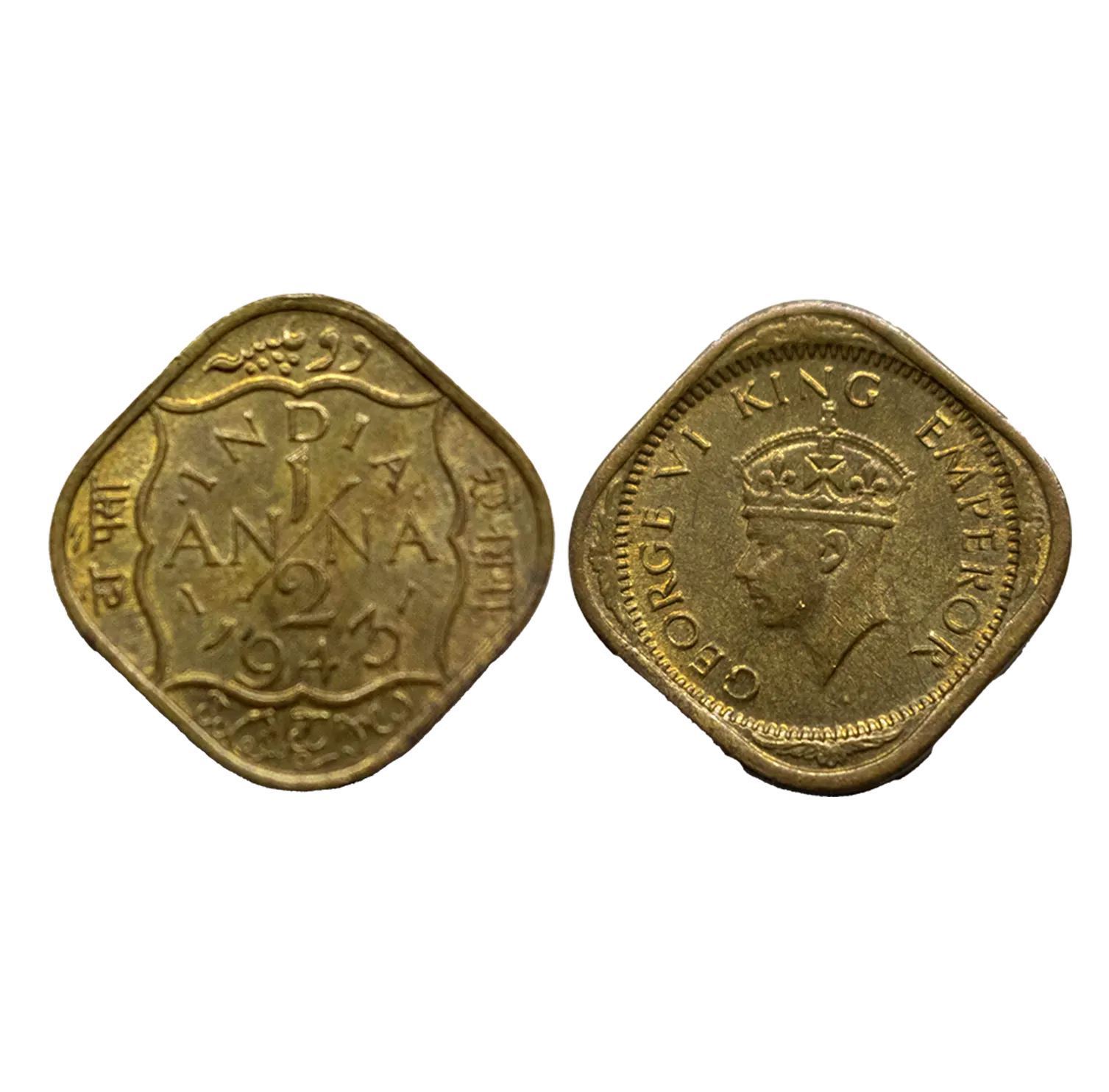 George VI, Nickel-Brass, 1/2 Anna, 1943, Calcutta Mint, Dots by India, Dashes by year, F. Prid 984.