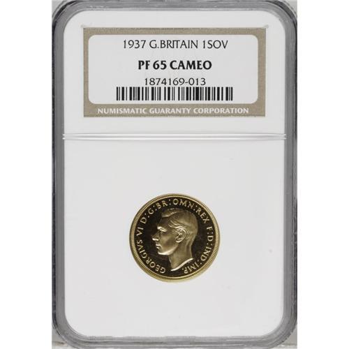 <B>George VI Proof Sovereign, 1937.</B></I> S-4076. 5,001 minted. PR65 Cameo NGC: Gem Proof, beautifully frosted with fairly deep cameo contrast. Has none of the often-seen adjustments through the horseman or the portrait done by the mint. Nicer than most of the Proofs this cataloguer has handled and/or described over the years, and even finer than one or two "PR66"s seen. In fact, this is a closely graded and especially beautiful example of this, the only Sovereign issued during this reign, therefore in keen demand worldwide by collectors.<BR><BR><b>Shipping:</b> Coin/Currency (<a target="_blank" href="http://www.heritageauctions.com/common/shipping.php">view shipping information</a>)