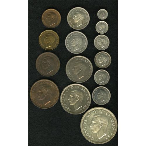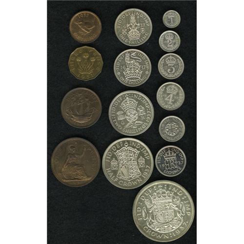 <B>George VI Proof set, 1937.</B></I> S-PS16. Another Coronation set, consisting of the crown, halfcrown, florin, both English and Scottish shillings, sixpence, silver threepence, 4-piece Maundy set, the brass threepence, the bronze penny, halfpenny and farthing. Another very pleasing set, the silver brilliant with some gray toning, the brass nice but having light spots, the bronzes reddish brown.