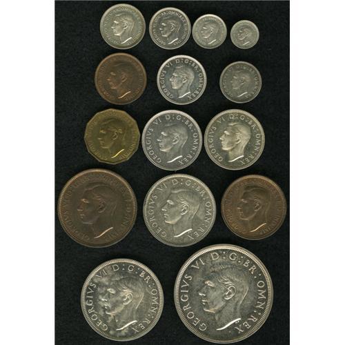 <B>George VI Proof set, 1937.</B></I> S-PS16. And a final Coronation set, again consisting of the crown, halfcrown, florin, both English and Scottish shillings, sixpence, silver threepence, 4-piece Maundy set, the brass threepence, the bronze penny, halfpenny and farthing. Also very pleasing set, the silver brilliant with some gray toning, the brass lovely, and the bronzes reddish brown.