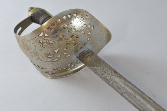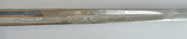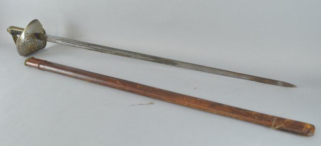 George VI Royal Engineers officers sword with etched blade, steel guard, shagreen and wire grip in leather scabbard
