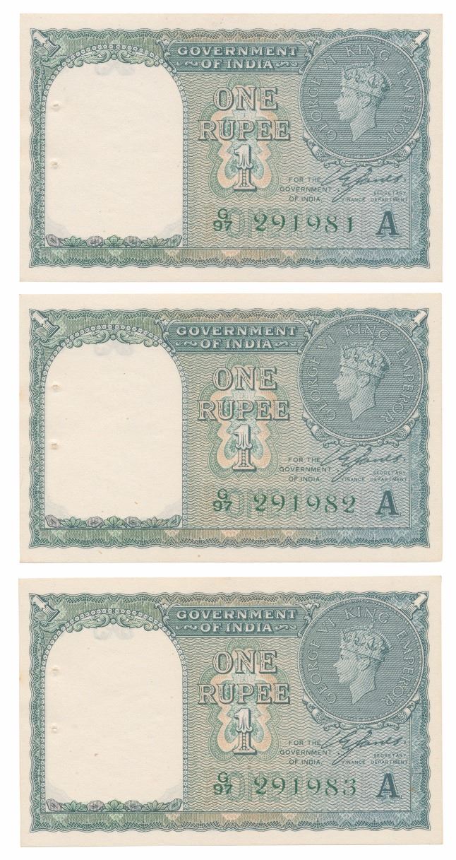 George VI, Rupee 1, 1947, signed C. E. Jones, serial number in green, in order of serial no. (J&R 4.1.1B). Uncirculated. (3)