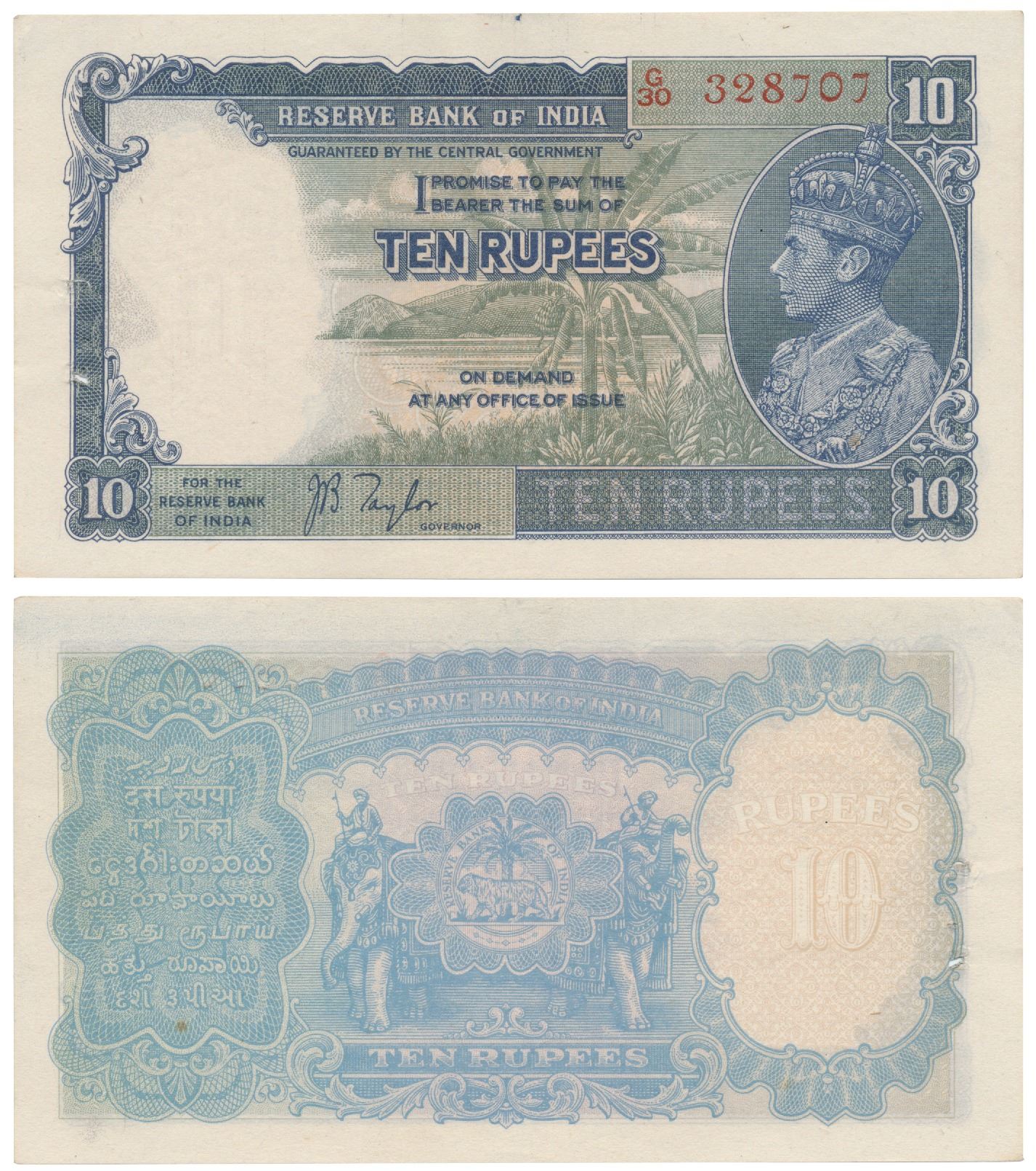 George VI, Rupees 10, 1st issue, 1938, signed J. B. Taylor, (J&R 4.5.1). Uncirculated.