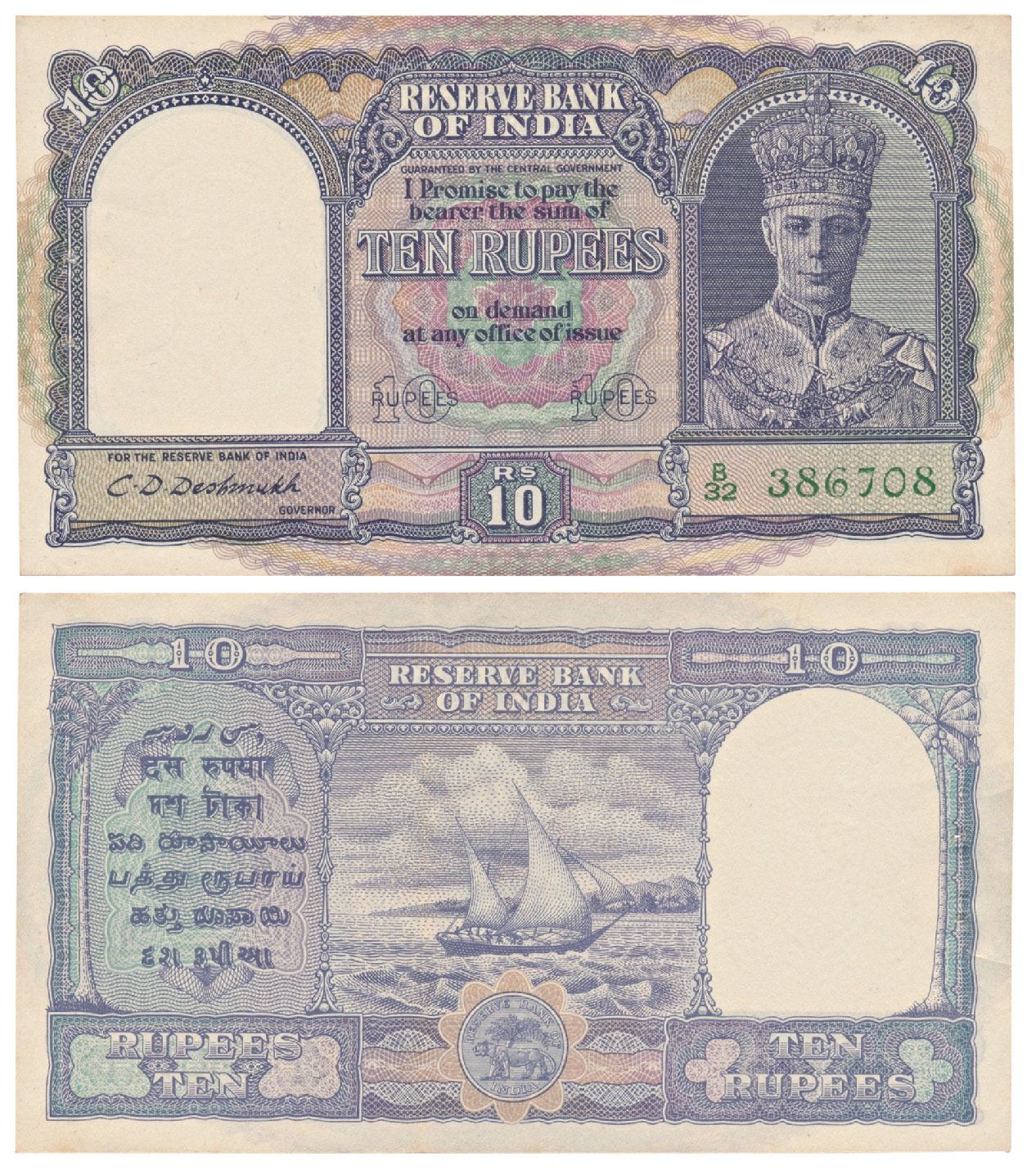 George VI, Rupees 10, 2nd issue, 1944, signed C. D. Deshmukh (J&R 4.6.1). Uncirculated.