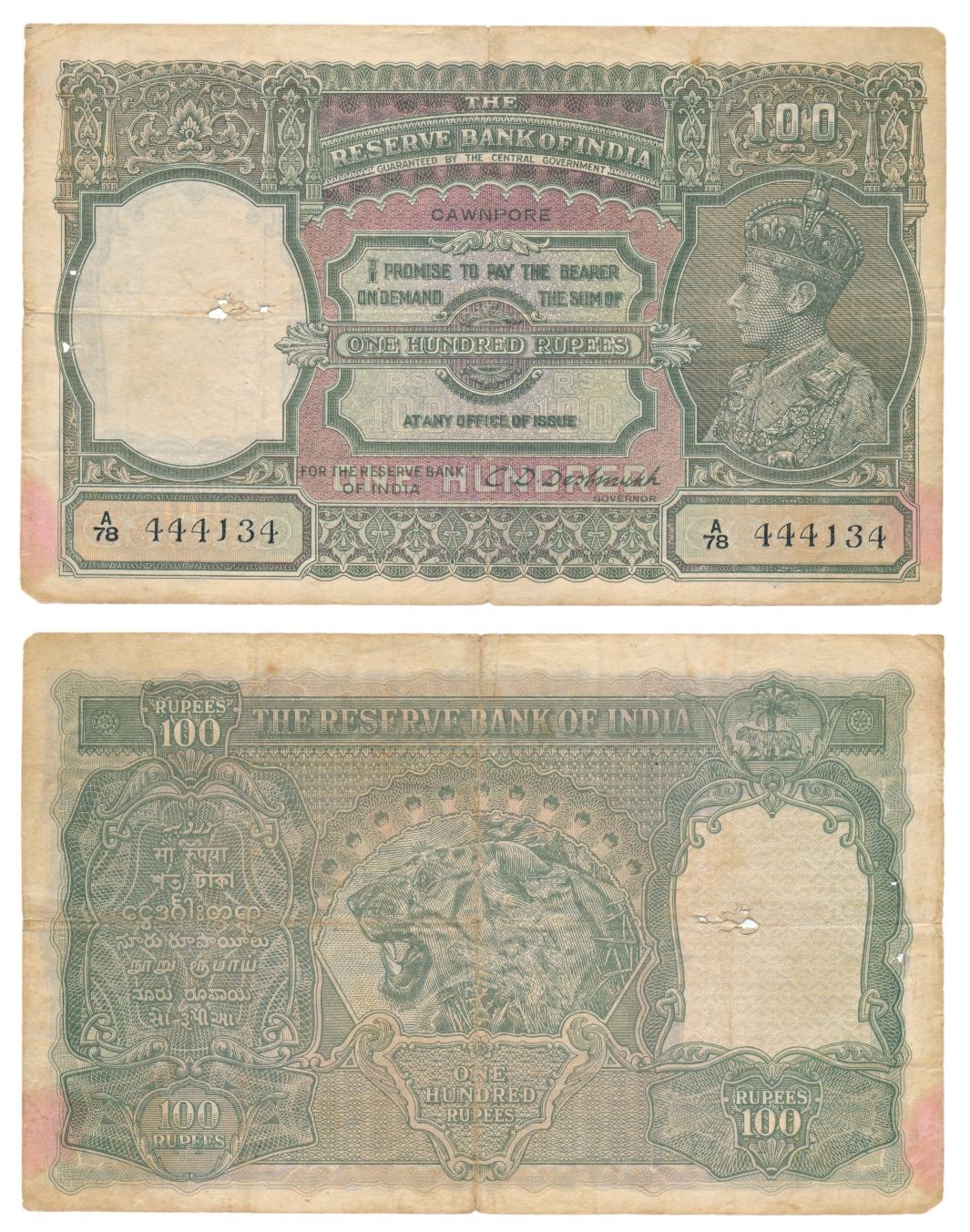 George VI, Rupees 100, 1938, Cawnpore, signed J. B. Taylor, (J&R 4.7.1C). Few spots, Very Fine+, Rare.
