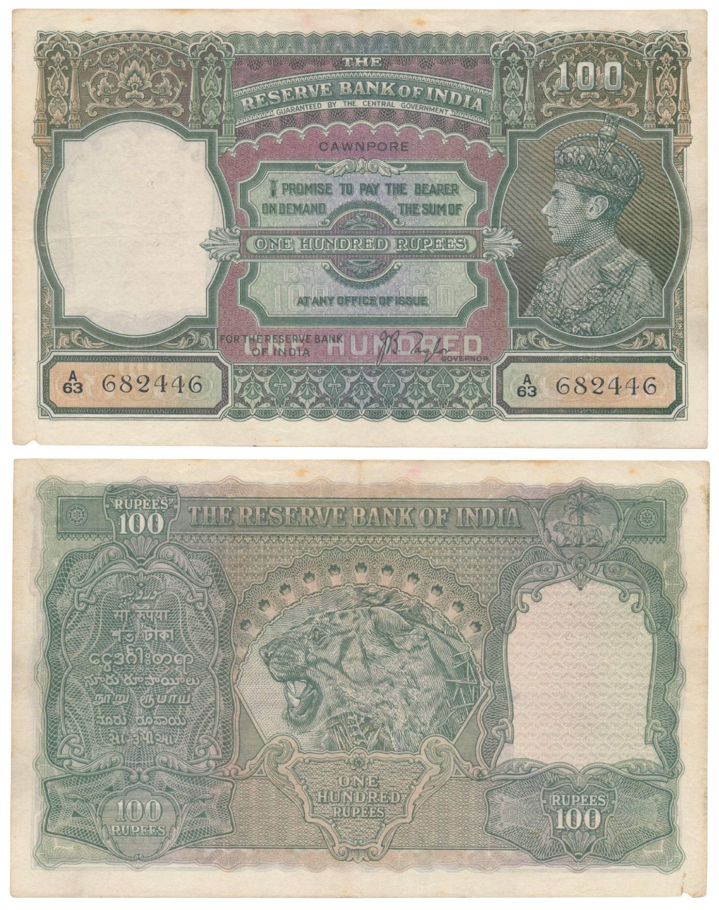 George VI, Rupees 100, 1938, Cawnpore, signed J. B. Taylor, (J&R 4.7.1C). Very slight tear at the bottom left corner, About Extremely Fine, Very Rare.