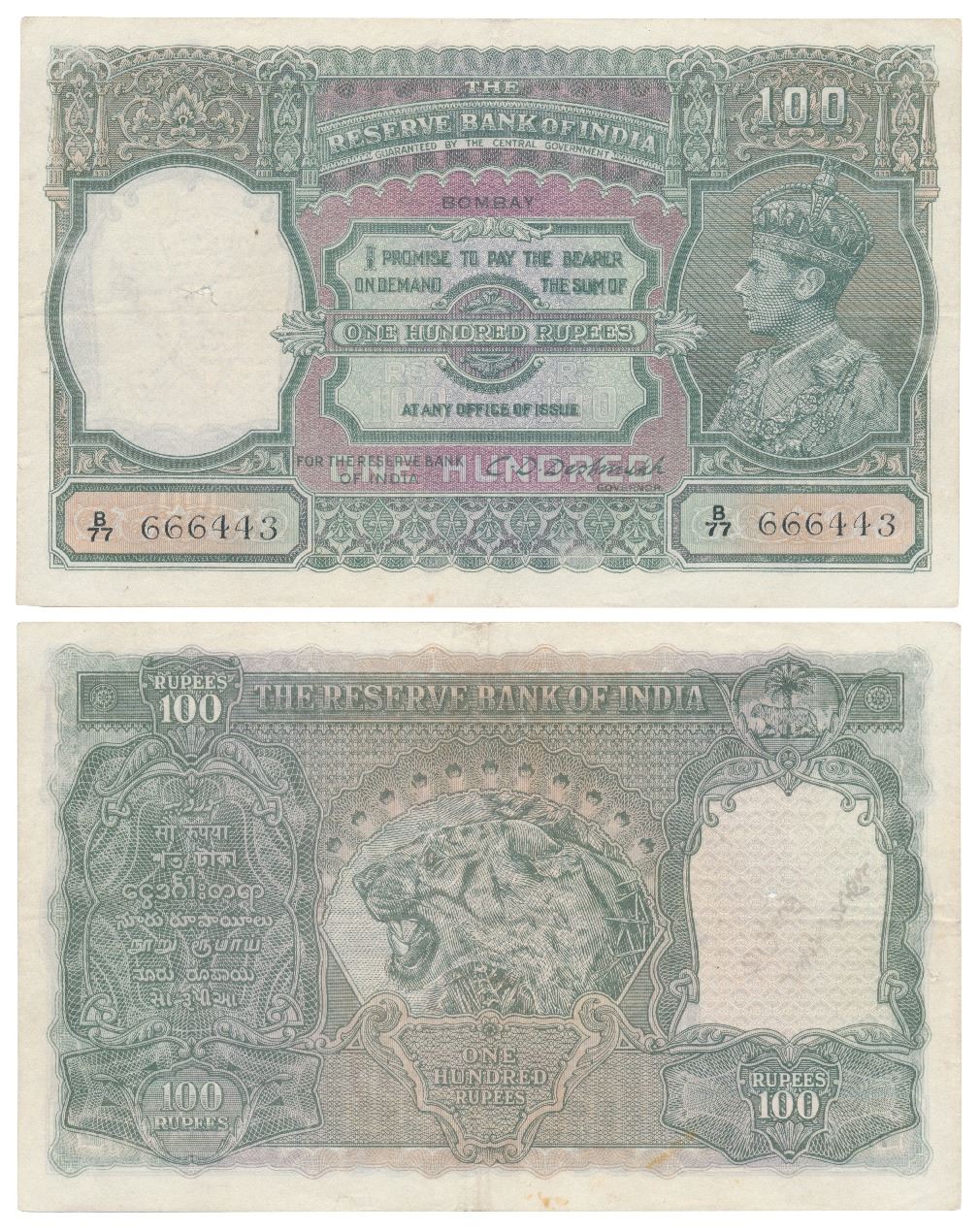 George VI, Rupees 100, 1944, Bombay, signed C. D. Deshmukh, front facing watermark, black serial number (J&R 4.7.3A). Extremely Fine, Very Rare.