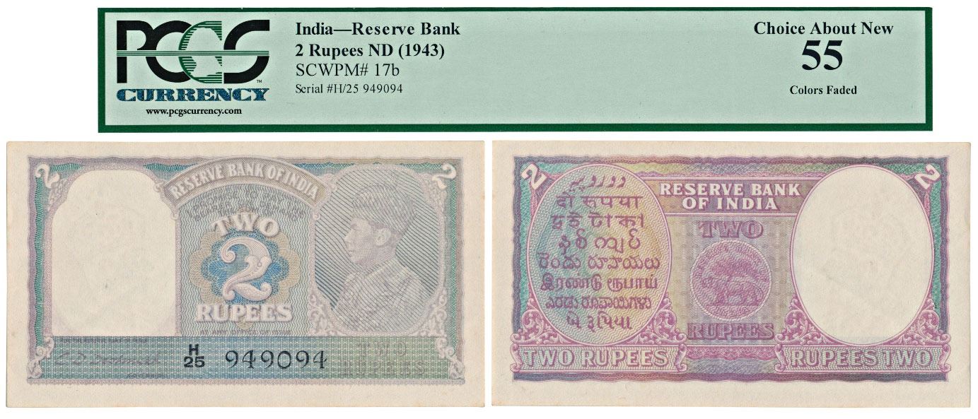 George VI, Rupees 2, 1943, signed C. D. Deshmukh, serial number in black (J&R 4.2.2). Graded by PCGS Choice About New 55, Colour faded, Uncirculated, distinct discoloration on the front side of the note.