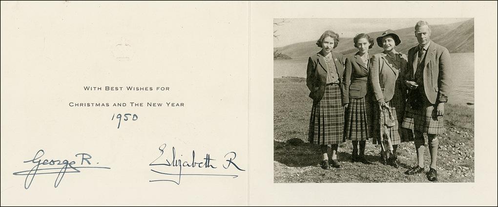 Christmas card from 1950, measuring 7 x 6 closed, inside bears a portrait of the royal family posing outdoors opposite a pre-printed sentiment which reads, “With best wishes for Christmas and the New Year,” and signed underneath, “George R,” and “Elizabeth R.” In fine condition.