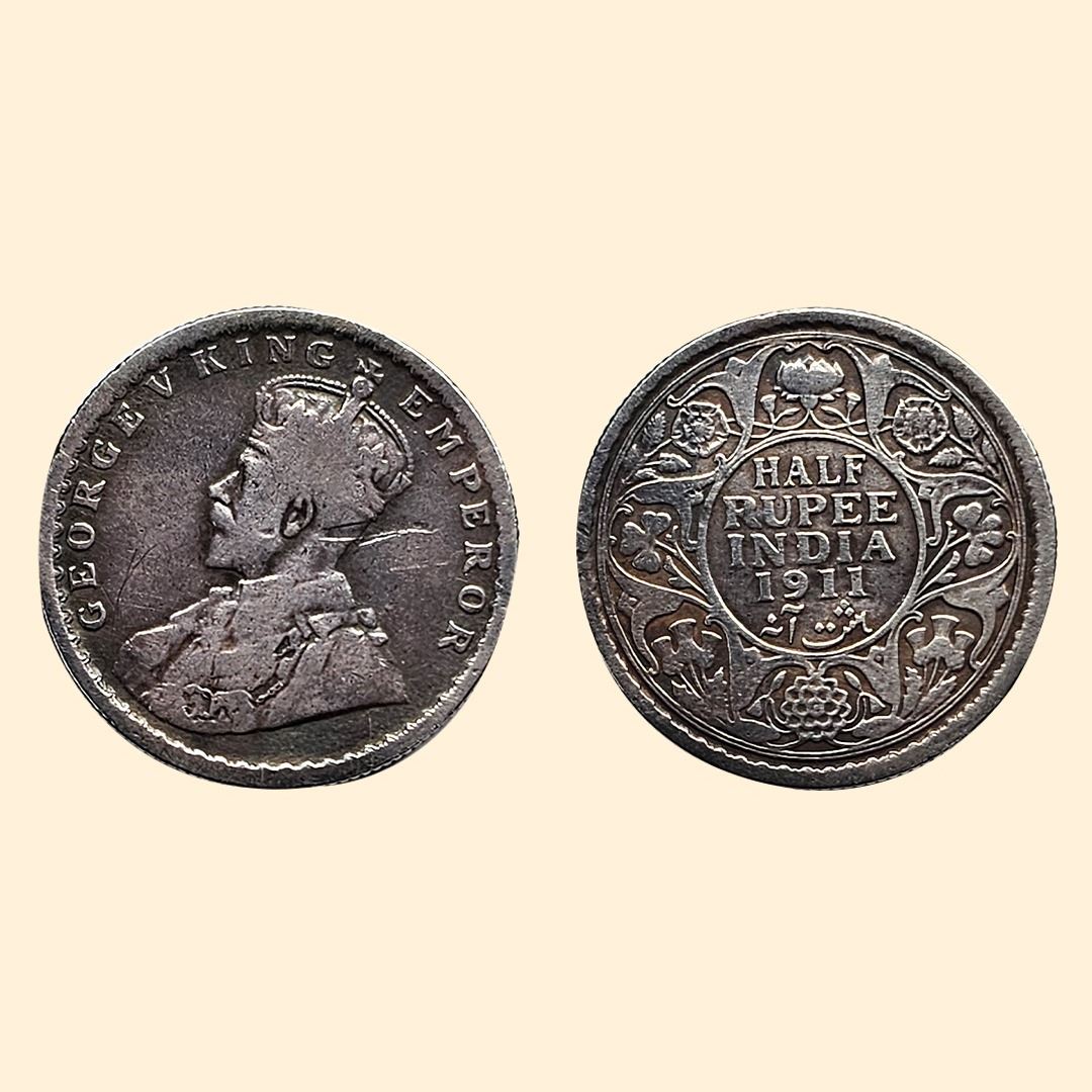 Note: 1911 Half Rupee issued in Calcutta Mint only. It is the most difficult year to obtain in the entire series of Half Rupees.