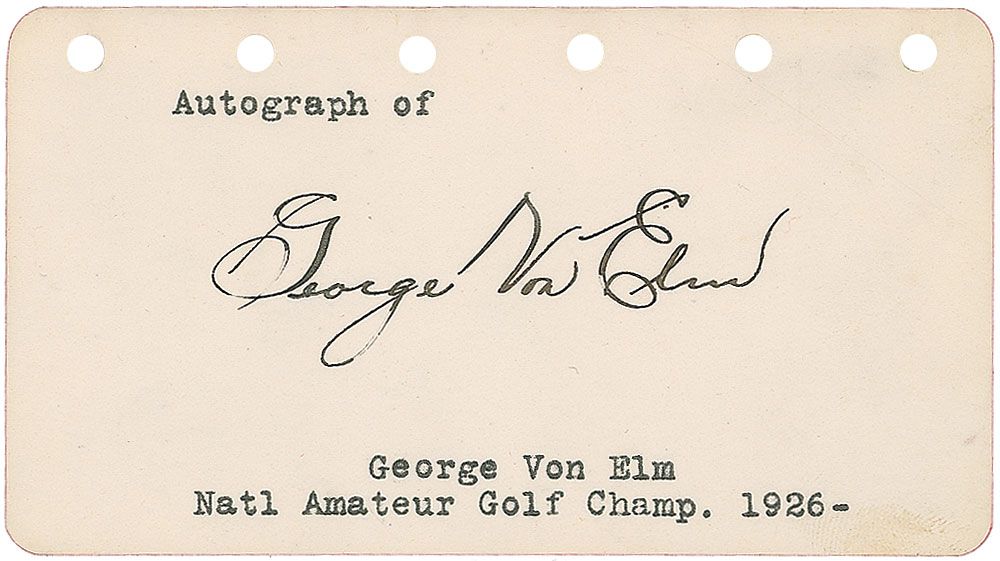 Legendary amateur golfer (1901–1961) known for his rivalry with Bobby Jones during the 1920s. Vintage ink signature, “George Von Elm,” on an off-white 4.5 x 2.5 page. In fine condition.