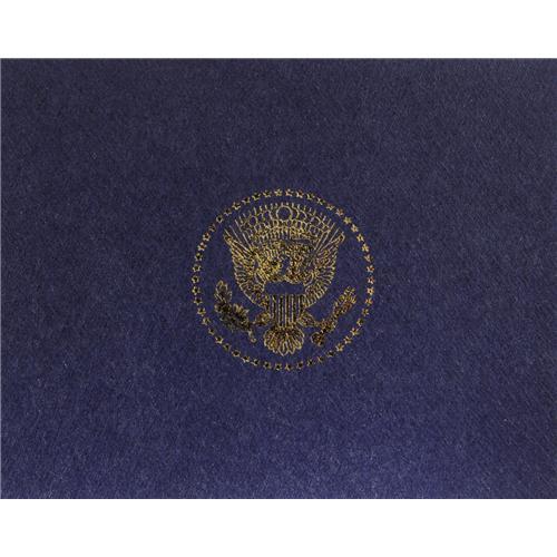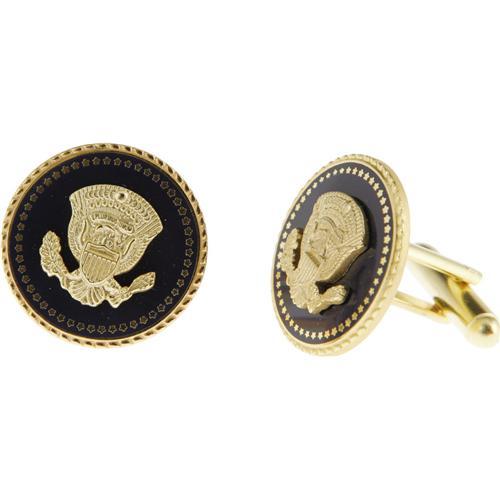 <B>George W. Bush Cobalt Presentation Cufflinks.</B></I> These cufflinks are gold plated with gilt edge and center inset, the presidential seal in the center of each cufflink is die struck and surrounded by a dark blue canton. On the reverse of each cufflink George W. Bush's signature is engraved into the cufflink. They come in a blue leatherette jewelers box and this is then placed into a cardboard box of the same blue color with the presidential seal embossed in gold on the top. In mint condition.