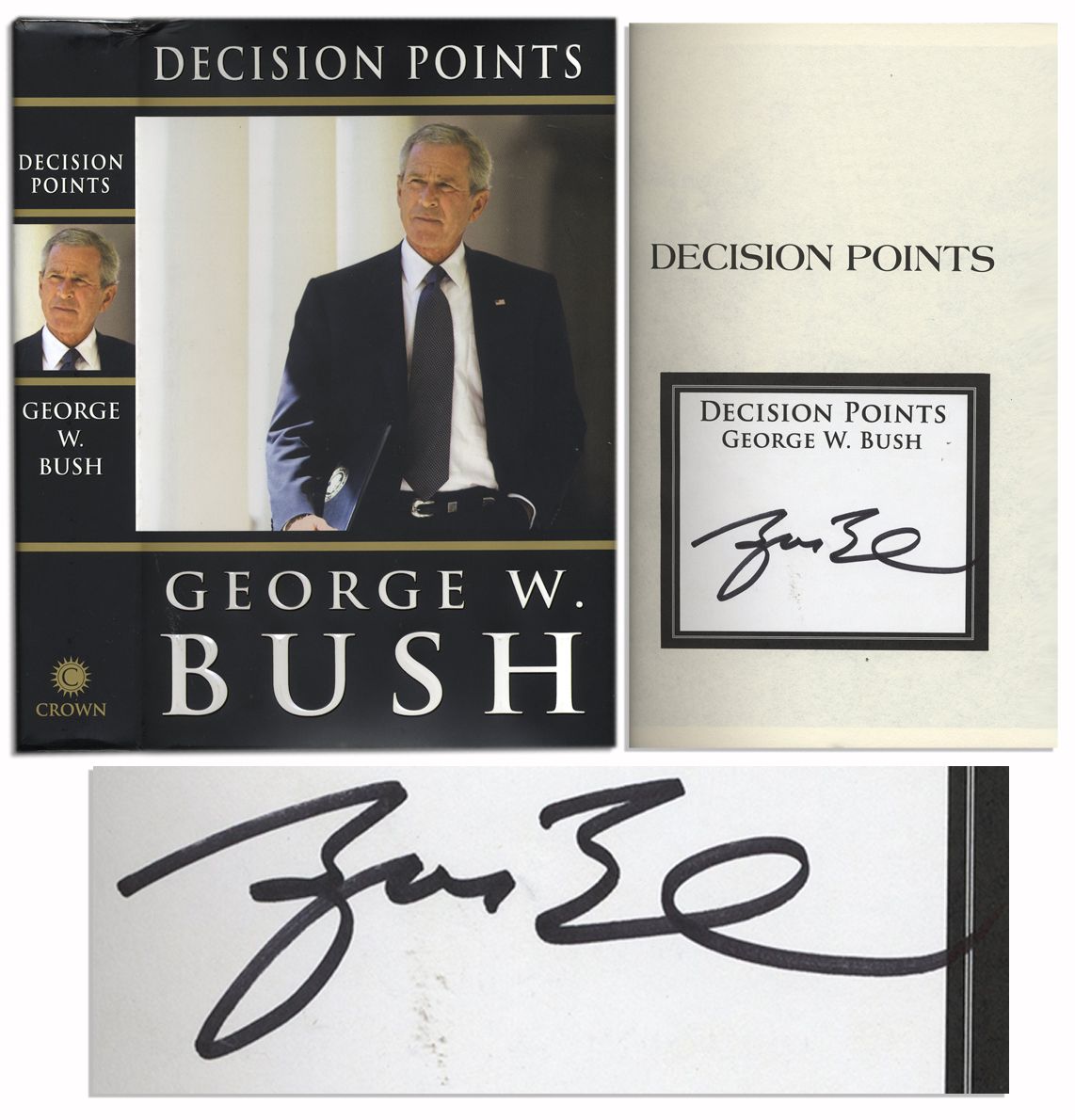 President George W. Bush signed bookplate accompanying the first edition of his book ''Decision Points.'' Crown Publishers: New York: 2010. This copy of President Bush's memoir is accompanied by a bookplate made especially for the book, signed ''George Bush'' in black marker. The book surpassed sales of two million copies less than two months after its release, breaking the record previously held by former President Bill Clinton's memoir. Measures 6.5'' x 9.5'' and runs 497pp., in fine condition.