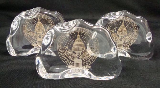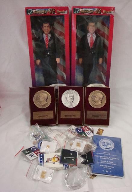 Grouping of presidential collectibles of George W.Bush. Group includes official inaugural medals and paperweights. W dolls, pin backs and more.