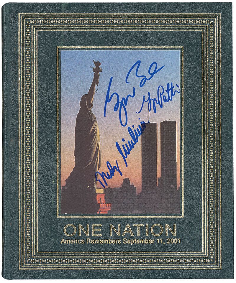 Signed book: One Nation: America Remembers September 11, 2001. First edition. Boston: Little, Brown and Company, 2001. Hardcover, 9.25 x 11, 192 pages. Signed on the front cover in blue felt tip by George W. Bush, Rudy Guiliani, and George Pataki. In fine condition.