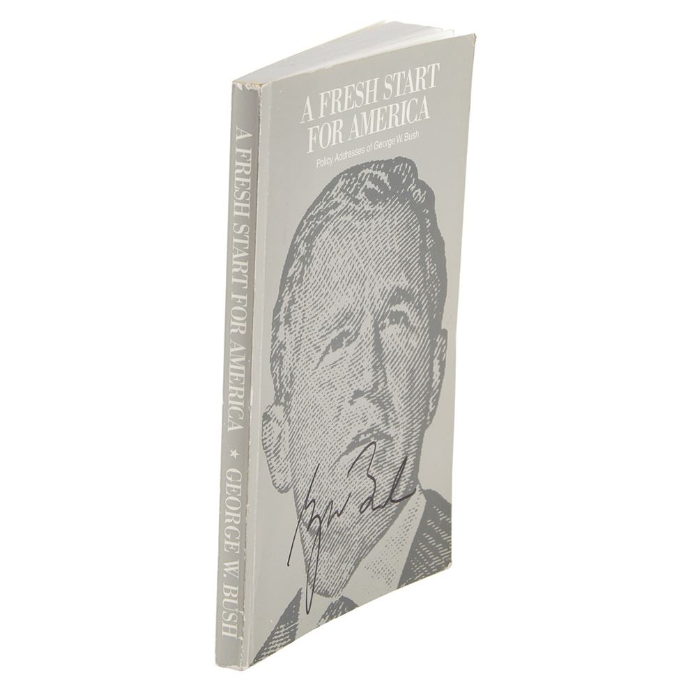Signed book: A Fresh Start for America: Policy Addresses of George W. Bush. Austin, Texas: Bush for President, Inc., 1999. Softcover, 5.25 x 8.25, 208 pages. Signed on the front cover in black felt tip by George W. Bush. In fine condition, with some slight rubbing to corners and edges.